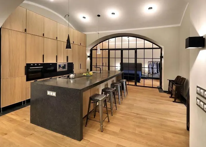 Cozinha totalmente equipada do apartamento Design Loft 2 Minutes To Wenceslas Square tem forno e máquina de lavar loiça. O apartamento Design Loft 2 Minutes To Wenceslas Square de 200 m² também está a uma distância aproximada de 5 minutos a pé da paragem Museum e a poucos passos da Muzeum.